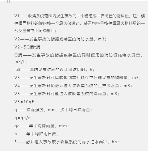 四、《化工建設項目環(huán)境保護設計規范》(GB 50483-2019),化工企業(yè)應急事故廢水池有效容積計算公式如下: