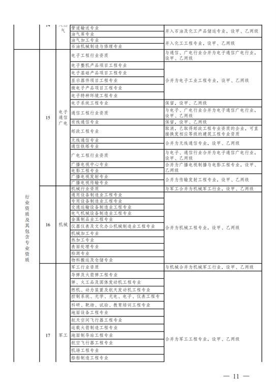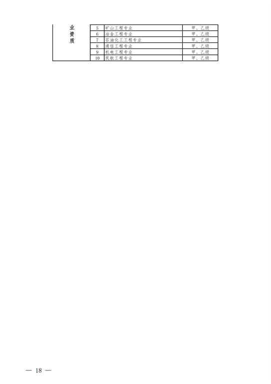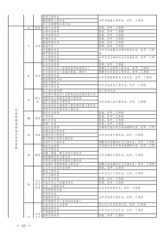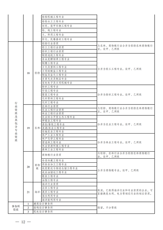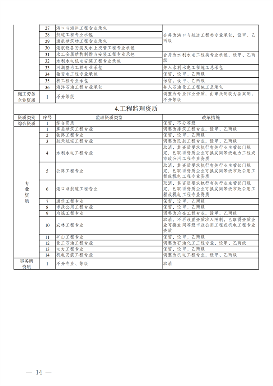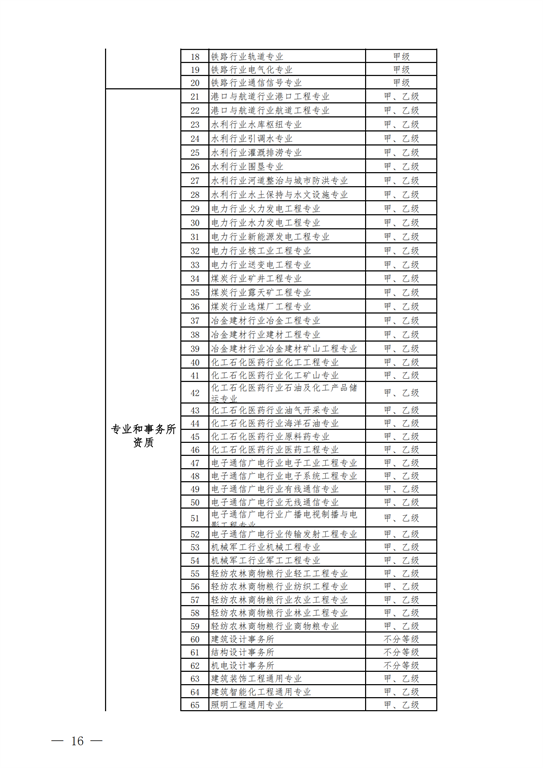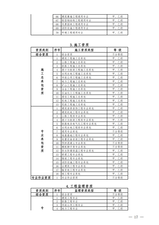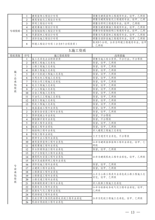 2.工程設計資質(zhì)。保留綜合資質(zhì);將21類(lèi)行業(yè)資質(zhì)整合為14類(lèi)行業(yè)資質(zhì);將151類(lèi)專(zhuān)業(yè)資質(zhì)、8類(lèi)專(zhuān)項資質(zhì)、3類(lèi)事務(wù)所資質(zhì)整合為70類(lèi)專(zhuān)業(yè)和事務(wù)所資質(zhì)。綜合資質(zhì)、事務(wù)所資質(zhì)不分等級;行業(yè)資質(zhì)、專(zhuān)業(yè)資質(zhì)等級原則上壓減為甲、乙兩級(部分資質(zhì)只設甲級)。