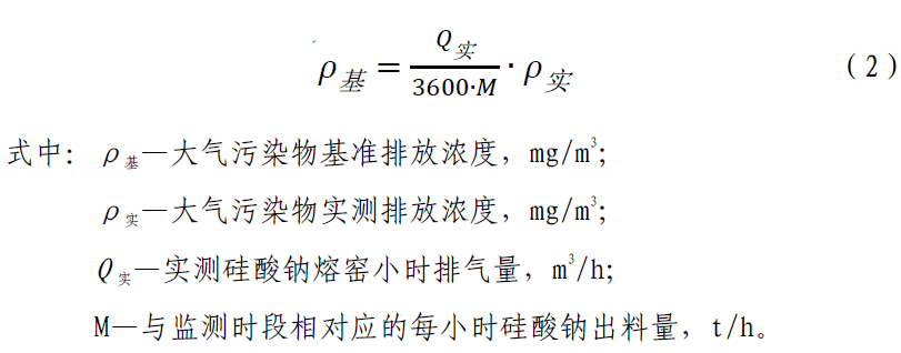 六、增加4.2.8 條,內容為:純氧燃燒硅酸鈉熔窯應監測排氣筒中大氣污染物排放濃度、排氣量及相應時(shí)間內的硅酸鈉出料量,按式(2)換算為基準排氣量(3600 m3/t 硅酸鈉)條件下的大氣污染物基準排放濃度,并以此作為達標判定依據。大氣污染物排放濃度、排氣量、產(chǎn)品產(chǎn)量的監測、統計周期為1 h,可連續采樣或等時(shí)間間隔采樣獲得大氣污染物排放濃度和排氣量數據,硅酸鈉出料量數據以企業(yè)統計報表為依據。