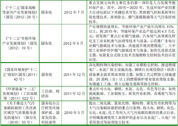 根據《國務(wù)院關(guān)于印發(fā)大氣污染防治行動(dòng)計劃的通知》(國發(fā)〔2013〕37號)的要求,到2017 年,全國地級及以上城市可吸入顆粒物濃度比2012 年下降10%以上;京津冀、長(cháng)三角、珠三角等區域細顆粒物濃度分別下降25%、20%、15%左右;加快重點(diǎn)行業(yè)脫硫、脫硝、除塵改造工程建設。所有燃煤電廠(chǎng)、鋼鐵企業(yè)的燒結機和球團生產(chǎn)設備、石油煉制企業(yè)的催化裂化裝置、有色金屬冶煉企業(yè)都要安裝脫硫設施,每小時(shí)20 蒸噸及以上的燃煤鍋爐要實(shí)施脫硫。除循環(huán)流化床鍋爐以外的燃煤機組均應安裝脫硝設施,新型干法水泥窯要實(shí)施低氮燃燒技術(shù)改造并安裝脫硝設施。燃煤鍋爐和工業(yè)窯爐現有除塵設施要實(shí)施升級改造;京津冀、長(cháng)三角、珠三角等區域要于2015 年底前基本完成燃煤電廠(chǎng)、燃煤鍋爐和工業(yè)窯爐的污染治理設施建設與改造,完成石化企業(yè)有機廢氣綜合治理。